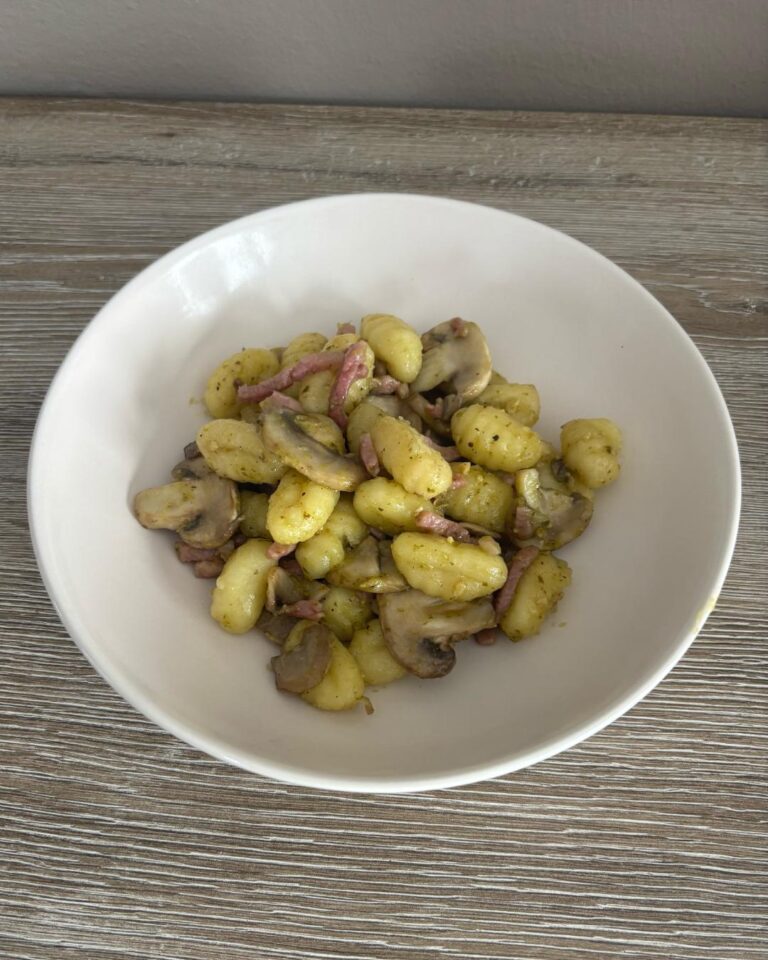 Gnocchis aux champignons, allumettes de lardons et pesto vert